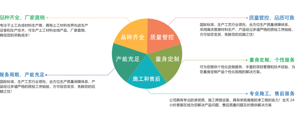 公司所有產(chǎn)品均采用國(guó)際標(biāo)準(zhǔn)組織生產(chǎn),并經(jīng)國(guó)家、市技術(shù)監(jiān)督局采標(biāo)驗(yàn)收,生產(chǎn)工藝及水平全國(guó)領(lǐng)先,屬國(guó)內(nèi)優(yōu)等水平,實(shí)物質(zhì)量達(dá)到國(guó)際先進(jìn)水平。經(jīng)用戶、施工單位使用證明,質(zhì)量穩(wěn)定可靠、施工方便、價(jià)格合理、售后服務(wù)完善。產(chǎn)品主要應(yīng)用于農(nóng)業(yè)、海綿城市建設(shè)、公路、鐵路、垃圾填埋場(chǎng)防滲,水利、電力、水土保持及環(huán)境綠化與基礎(chǔ)建設(shè)領(lǐng)域,已被廣泛應(yīng)用于高速公路、鐵路、垃圾填埋場(chǎng)等多項(xiàng)國(guó)家重點(diǎn)工程,受到工程界專家及廣大用戶的一致好評(píng)。